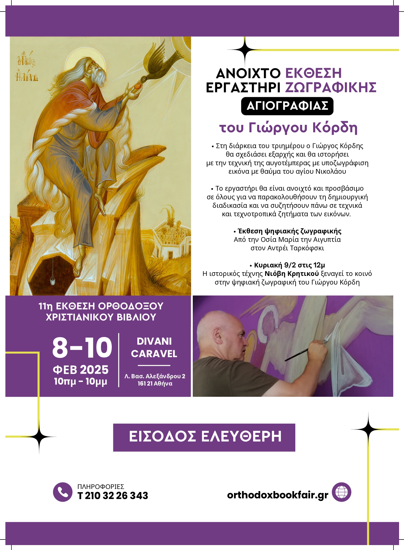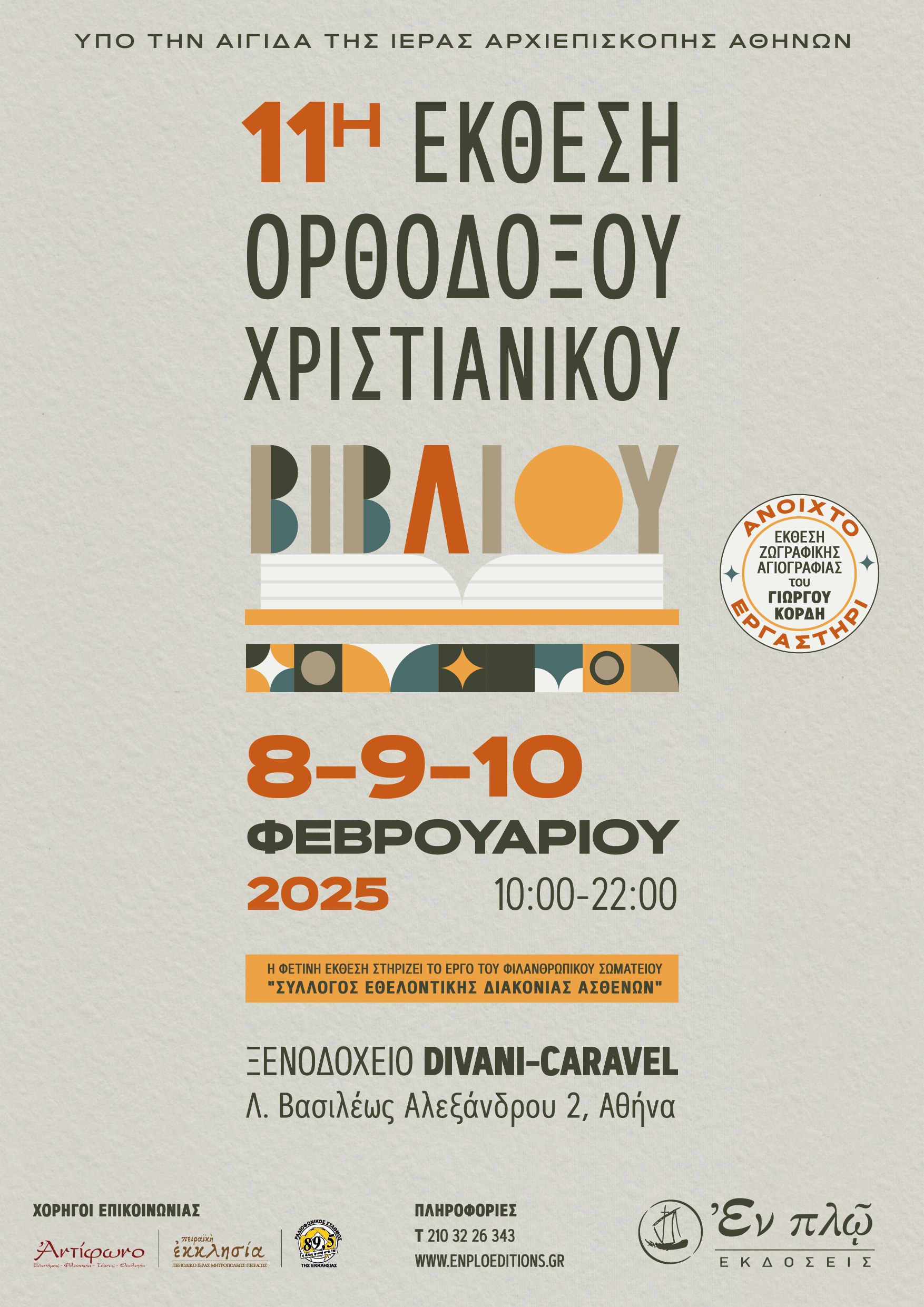 Οι εκδόσεις Εν Πλω, σε συνεργασία με πολλούς εκδοτικούς οίκους, και με κύριο στόχο την προβολή, τη διάδοση του ποιοτικού βιβλίου και την καλλιέργεια της φιλαναγνωσίας, διοργανώνουν, για 11η χρονιά και υπό την αιγίδα της Ιεράς Αρχιεπισκοπής Αθηνών, Έκθεση Ορθόδοξου Χριστιανικού Βιβλίου στην Αθήνα, στο Ξενοδοχείο DIVANI CARAVEL (Λ. Βασ. Αλεξάνδρου 2, Αθήνα), το Σάββατο 8, την Κυριακή 9 και τη Δευτέρα 10 Φεβρουαρίου, με μια μεγάλη ποικιλία τίτλων ορθόδοξης πνευματικότητας.