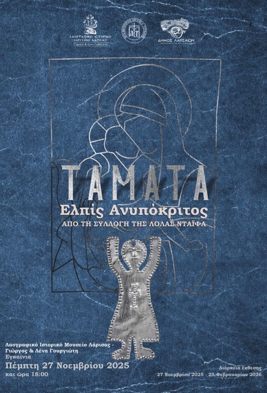 Το Λαογραφικό Ιστορικό Μουσείο Λάρισας – Γιώργος και Λένα Γουργιώτη, σε συνεργασία με την Ιερά Μητρόπολη Λαρίσης και Τυρνάβου, εγκαινιάζει την Πέμπτη 27 Νοεμβρίου 2025 και ώρα 18:00 τη νέα περιοδική έκθεση «Τάματα, Ἐλπίς Ἀνυπόκριτος», που παρουσιάζει τάματα από την ιδιωτική Συλλογή της κ. Λόλας Νταϊφά.