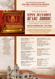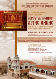 Ώρα 20:00 μ.μ. – 01:00 π.μ. Αγιορείτικη Αγρυπνία και εγκώμια της Αγίας Άννης. Θα ψάλλει η χορωδία « Βυζαντινός Χορός ¨Άγιος Πέτρος Επίσκοπος Άργους¨ ».