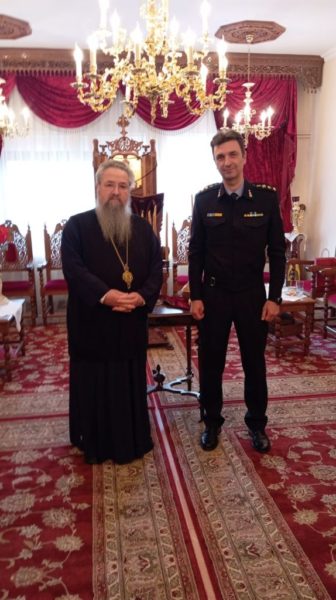 Ο Σεβασμιώτατος υποδέχτηκε στο Επισκοπείο το νέο Διοικητή συνοδευόμενο από τον Αντιπύραρχο κ. Σπυρίδωνα Λάζαρη και στην συνάντηση που ακολούθησε τόνισε μεταξύ άλλων ότι η Ιερά Μητρόπολη Λευκάδος και Ιθάκης θα είναι αρωγός σε κάθε προσπάθεια της Π.Υ. Λευκάδος, που στοχεύει στο κοινό καλό του νησιού, ευχόμενος στον κ. Καλαϊτζίδη καλή δύναμη και επιτυχία στα νέα του καθήκοντα.