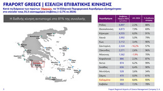 Σύμφωνα με τα στοιχεία της Fraport Greece, οι 12 στους 14 προορισμούς που διαχειρίζεται έχουν θετικό πρόσημο συγκριτικά με την ίδια περσινή περίοδο. Μοναδικές εξαιρέσεις είναι η Σαντορίνη και η Μύκονος.