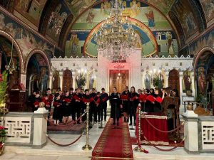 Η εξαιρετική αυτή ομιλία «αγκαλιάσθηκε» στο Α’ μέρος από την Παιδική και Γυναικεία Χορωδία της Σχολής Βυζαντινής Μουσικής «ΑΓΙΟΣ ΛΕΩΝΙΔΗΣ» της Ι. Μητροπόλεως μας υπό τη διεύθυνση της κ. Χριστίνας – Παταπίας Μήτρου με ύμνους της Εορτής των Χριστουγέννων και Βυζαντινά Κάλαντα. Ενώ μετά το πέρας της ομιλίας η Χορωδία «ΑΓΙΟΣ ΚΥΡΙΑΚΟΣ Ο ΥΜΝΟΓΡΑΦΟΣ» υπό την Διεύθυνση του κ. Βασιλείου Κουφογιάννη, Προέδρου του Συλλόγου Ιεροψαλτών Κορινθίας με τον αυτό τίτλο, απέδωσαν Χριστουγεννιάτικους Εκκλησιαστικούς Βυζαντινούς ύμνους καταλήγοντας με το «Κοινωνικόν» της Εορτής «Λύτρωσιν ἀπέστειλε Κύριος τῷ λαῷ αὐτοῦ», που εμπερικλείει το νόημα της μεγάλης εορτής της Πίστεώς μας.