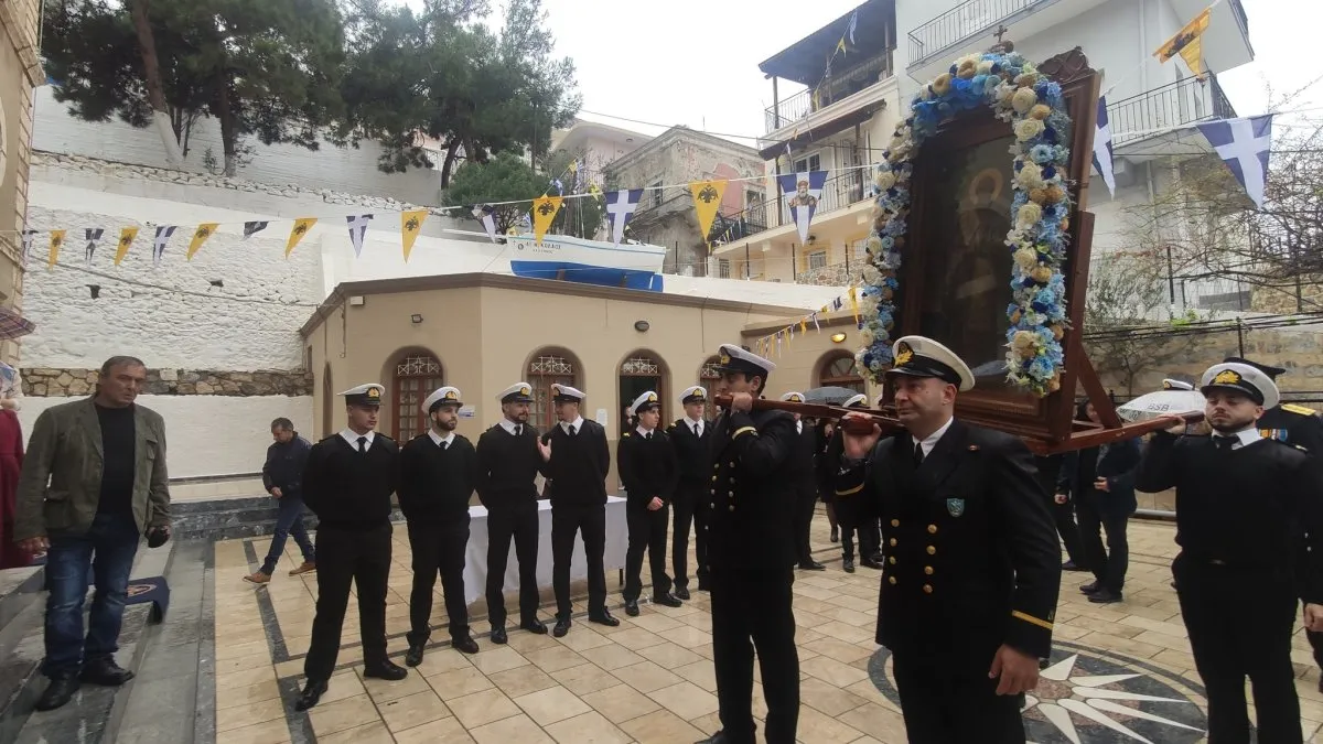 Την Ιερά Εικόνα βάσταζαν άνδρες του Λιμεναρχείου Καλύμνου, ενώ τιμητικό άγημα από το 5/42 ΣΕ συνόδευε την πομπή, σπουδαστές της ΑΕΝ, μαθητές και πρόσκοποι.
