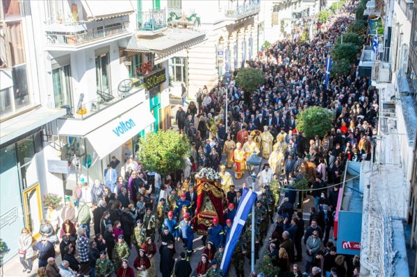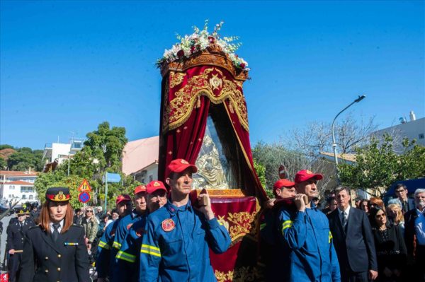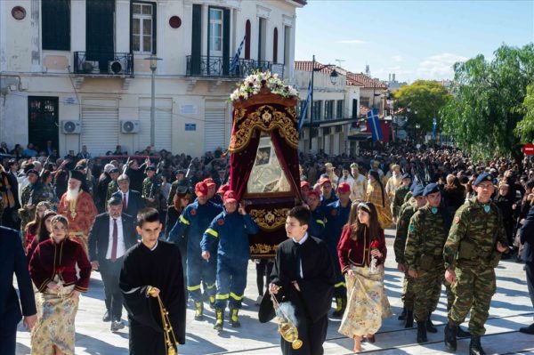 Με το πέρας της Θείας Λειτουργίας ακολούθησε πάνδημη λιτάνευση της θαυματουργού εικόνος της Παναγίας στις κεντρικές οδούς της Πόλεως, προς ευλογία και αγιασμό των κατοίκων και των προσκυνητών. Τιμές κατά τη λιτανεία απέδωσαν άγημα του Στρατού καθώς και Φιλαρμονικές.