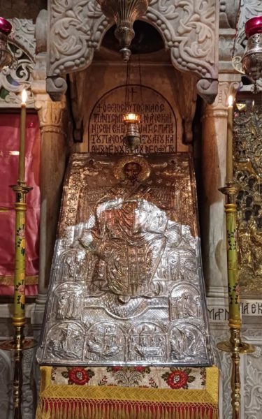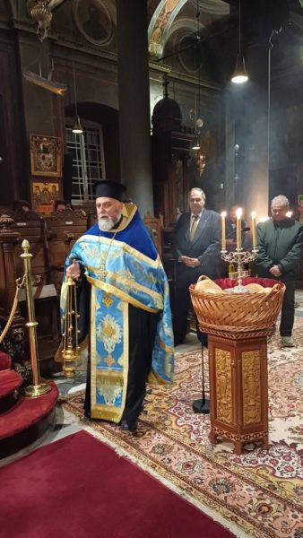 Ακολούθησε σύντομη λιτάνευση της Ιεράς Εικόνος του Αγίου λόγω των καιρικών συνθηκών, προς αγιασμόν του Λιμένος και των θαλασσών και η αρτοκλασία.