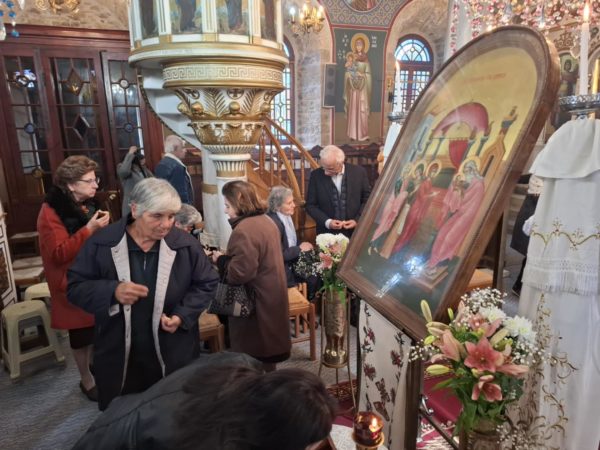 Πριν την απόλυση της Θείας Λειτουργίας, ο Σεβασμιώτατος Μητροπολίτης Καρυστίας και Σκύρου κ. Σεραφείμ, στην ομιλία του αναφέρθηκε στο σεβάσμιο πρόσωπο του Δίκαιου και ευλαβούς Συμεών, τον οποίον προβάλει η εκκλησιαστική παράδοση για την εορτή της Υπαπαντής του Κυρίου ημών Ιησού Χριστού, τονίζοντας ο Σεβασμιώτατος κ. Σεραφείμ ότι και οι πιστοί οφείλουν να ακολουθήσουν το παράδειγμα του Δίκαιου Συμεών και να γίνουν θεοδόχοι.