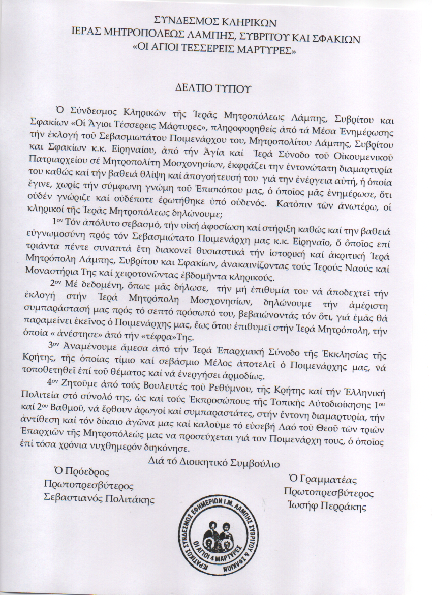 Ὁ Σύνδεσμος Κληρικῶν τῆς Ἱερᾶς Μητροπόλεως Λάμπης, Συβρίτου και Σφακίων «Οἱ Ἅγιοι Τέσσερεις Μάρτυρες», πληροφορηθείς ἀπό τά Μέσα Ἐνημέρωσης τήν ἐκλογή τοῦ Σεβασμιωτάτου Ποιμενάρχου του, Μητροπολίτου Λάμπης, Συβρίτου και Σφακίων κ.κ. Εἰρηναίου, ἀπό τήν Ἁγία καί Ἱερά Σύνοδο τοῦ Οἰκουμενικοῦ Πατριαρχείου σέ Μητροπολίτη Μοσχονησίων, ἐκφράζει την ἐντονώτατη διαμαρτυρία του καθώς καί τήν βαθειά θλίψη καί ἀπογοήτευσή του γιά την ἐνέργεια αὐτή, ἡ ὁποία ἔγινε, χωρίς τήν σύμφωνη γνώμη τοῦ Ἐπισκόπου μας, ὁ ὁποῖος μᾶς ἐνημέρωσε, ὅτι οὐδέν γνώριζε καί οὐδέποτε ἐρωτήθηκε ὑπό οὑδενός.