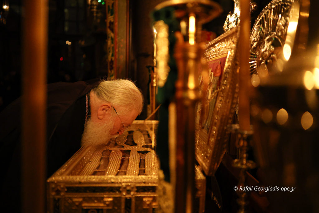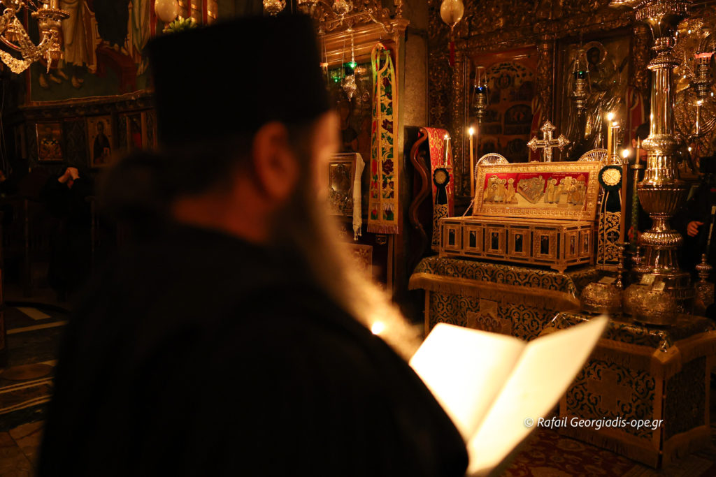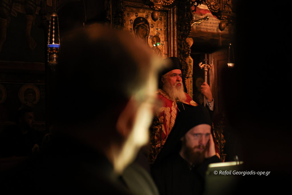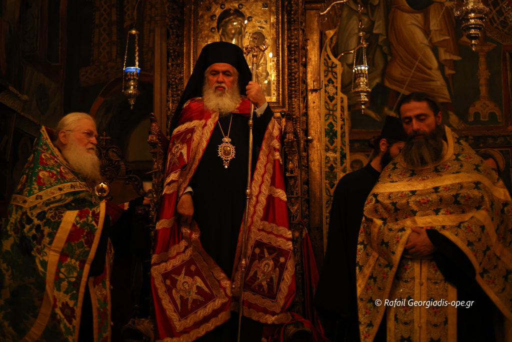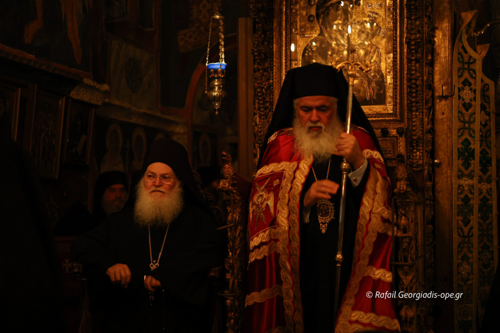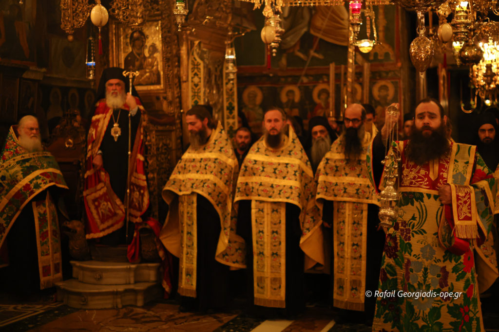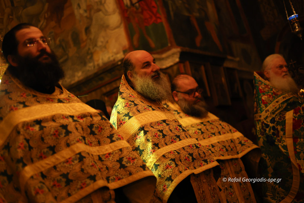 Του Πανηγυρικού Εσπερινού προεξάρχει ο Μητροπολίτης Νεαπόλεως και Σταυρουπόλεως κ. Βαρνάβας, πλαισιούμενος από τον Καθηγούμενο της Ιεράς Μονής Βατοπαιδίου Γέροντα Εφραίμ, ιερείς και διακόνους.