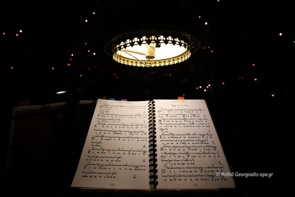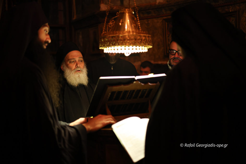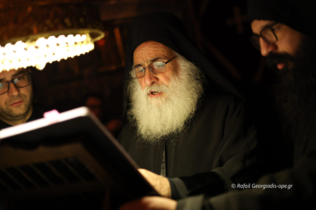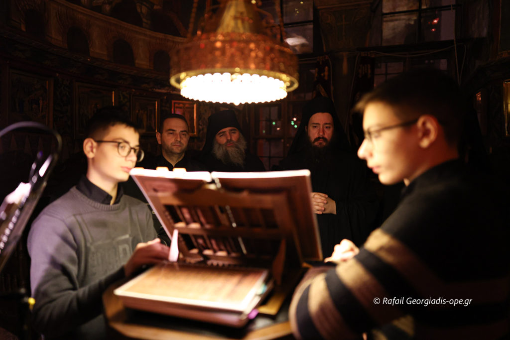 Τους ιερούς ύμνους αποδίδουν με κατάνυξη ο Πρωτοψάλτης κ.Ιωάννης Χασανίδης με την χορωδία του, καθώς και μαθητές της Ακαδημίας Ψαλτικής Ειρμός με την καθοδήγηση του κ. Σπυρίδων Ασπιώτη, πλαισιούμενοι από Βατοπαιδινούς Πατέρες.