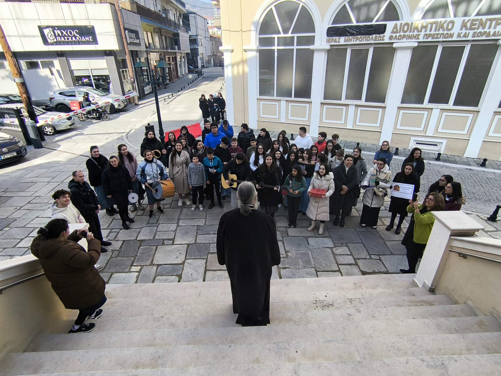 Στη συνέχεια, μπροστά στο Επισκοπείο, μαθητές και μαθήτριες του Πρότυπου Εκκλησιαστικού Γυμνασίου – Λυκείου Φλώρινας αλλά φοιτήτριες των κατηχητικών συνάξεων του Μητροπολιτικού Ναού του Αγίου Παντελεήμονος έψαλαν τα κάλαντα στον Σεβασμιώτατο δημιουργώντας εορταστικό κλίμα.