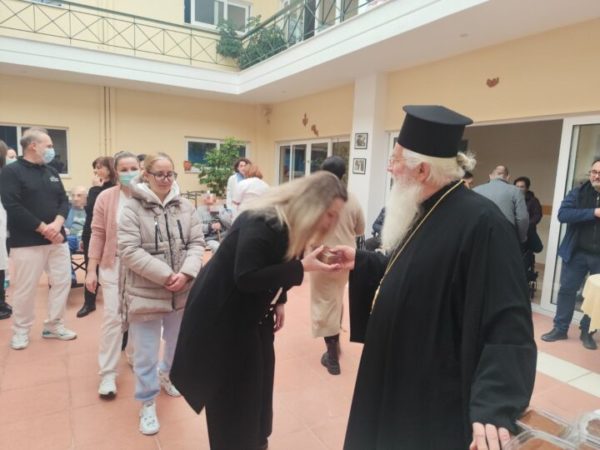Στη συνέχεια ο Σεβασμιώτατος Ποιμενάρχης ευλόγησε τη βασιλόπιτα του θεραπευτηρίου παρουσία του Διοικητικού Συμβουλίου, των εργαζομένων και των τροφίμων. Ο Σεβασμιώτατος μοίρασε τη βασιλόπιτα στους τροφίμους του θεραπευτηρίου και σε όλους τους παρισταμένους και τους ευχήθηκε καλή και ευλογημένη χρονιά με υγεία, επίσης ευχήθηκε στους εργαζόμενους καλό κουράγιο και καλή υπομονή στο δύσκολο έργο τους.