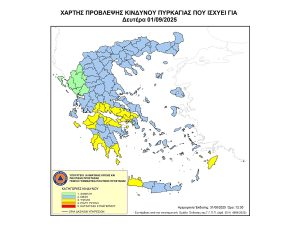 Σύμφωνα με το Χάρτη Πρόβλεψης Κινδύνου Πυρκαγιάς, τον οποίο εκδίδει η Γενική Γραμματεία Πολιτικής Προστασίας του Υπουργείου Κλιματικής Κρίσης & Πολιτικής Προστασίας για τη Δευτέρα 1η Σεπτεμβρίου 2025 προβλέπεται υψηλός κίνδυνος δασικής πυρκαγιάς (κατηγορία κινδύνου 3) στις Περιφερειακές Ενότητες Κορινθίας, Λακωνίας και Μεσσηνίας.